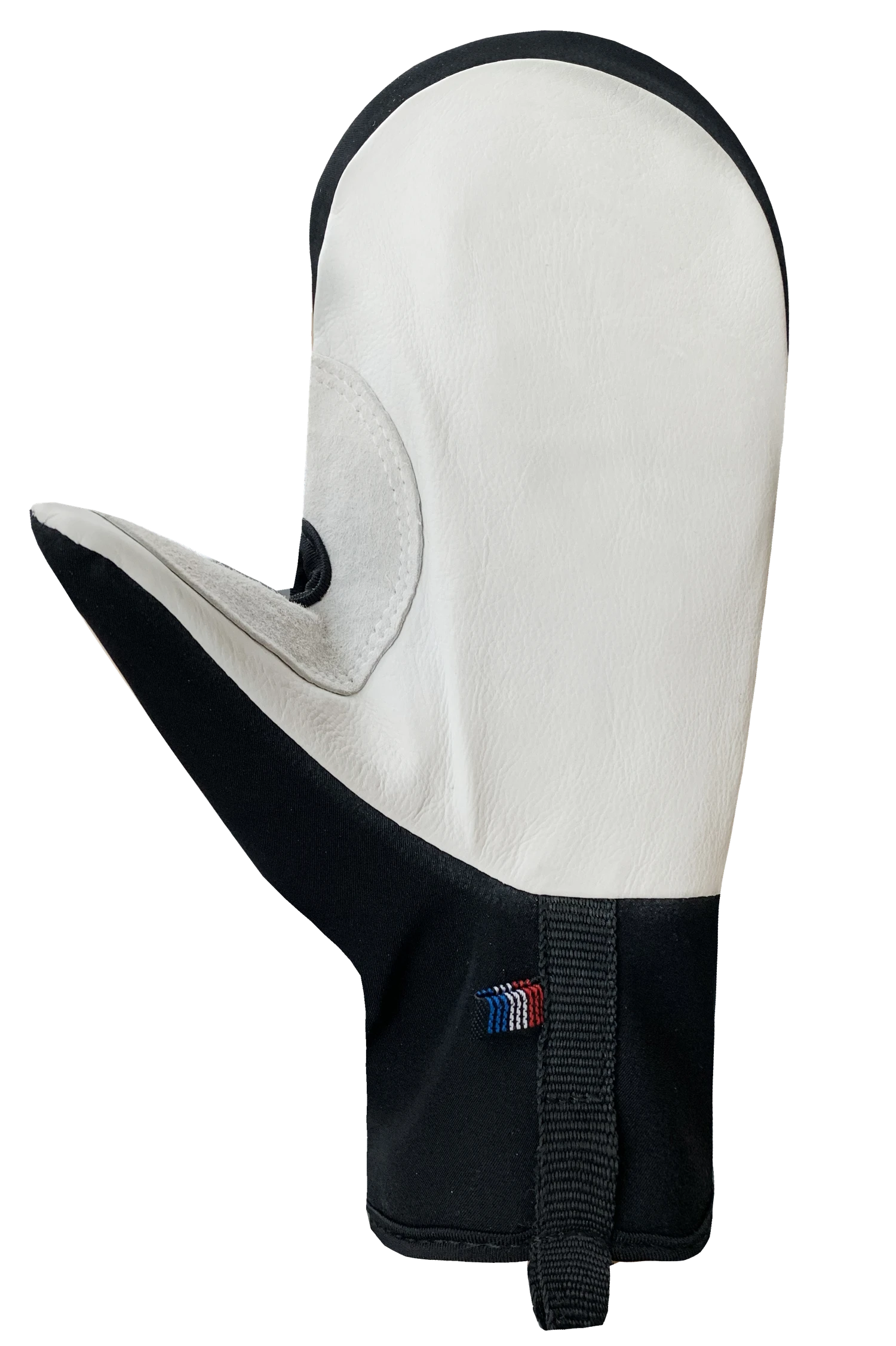 Rip-off softshell glove cover to keep hands warm during training. The large velcro tab with easy-grab puller fits over a nordic ski pole strap and has a soft knit nose wipe. It has a durable cow leather palm with thumb crotch reinforcement.